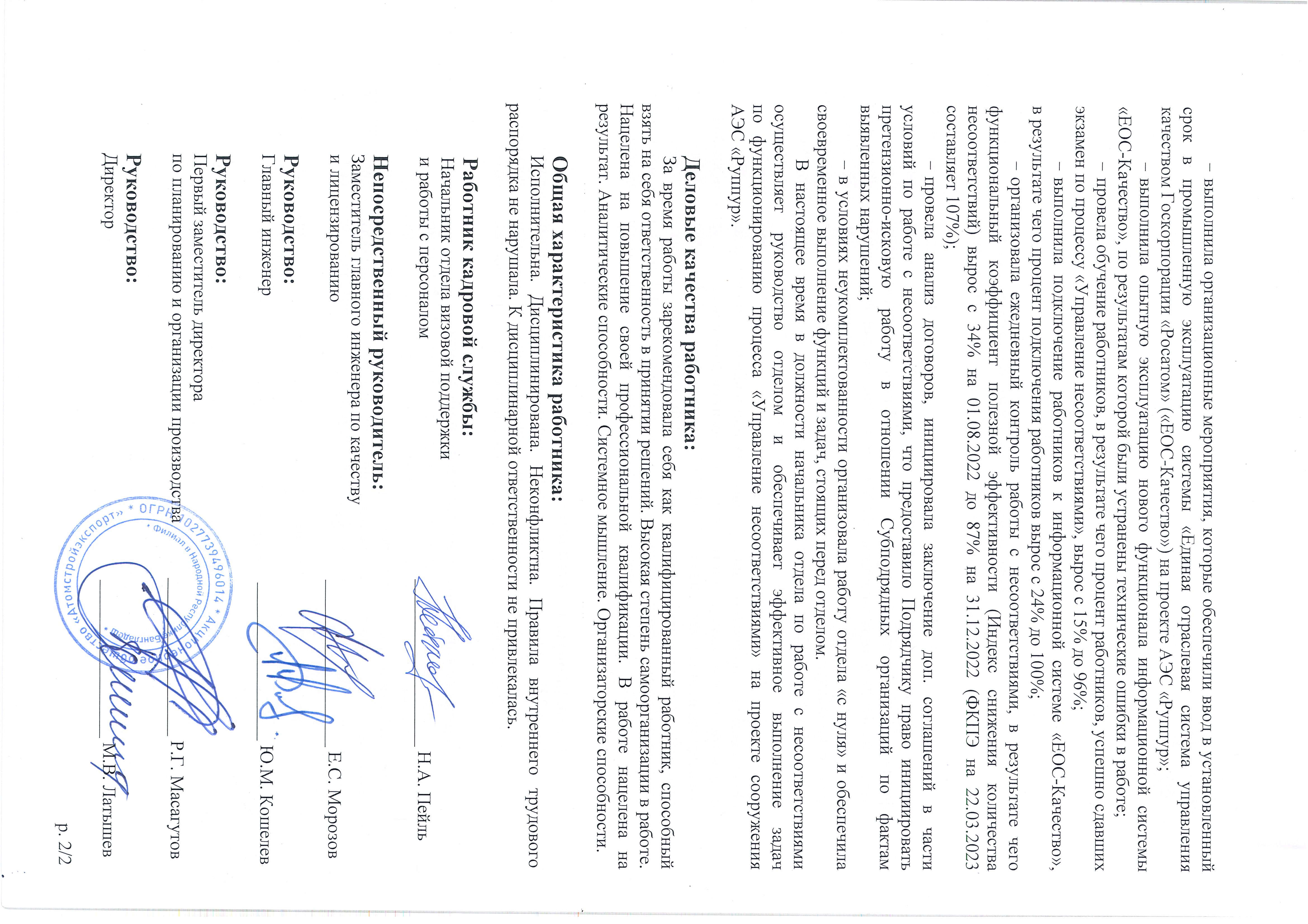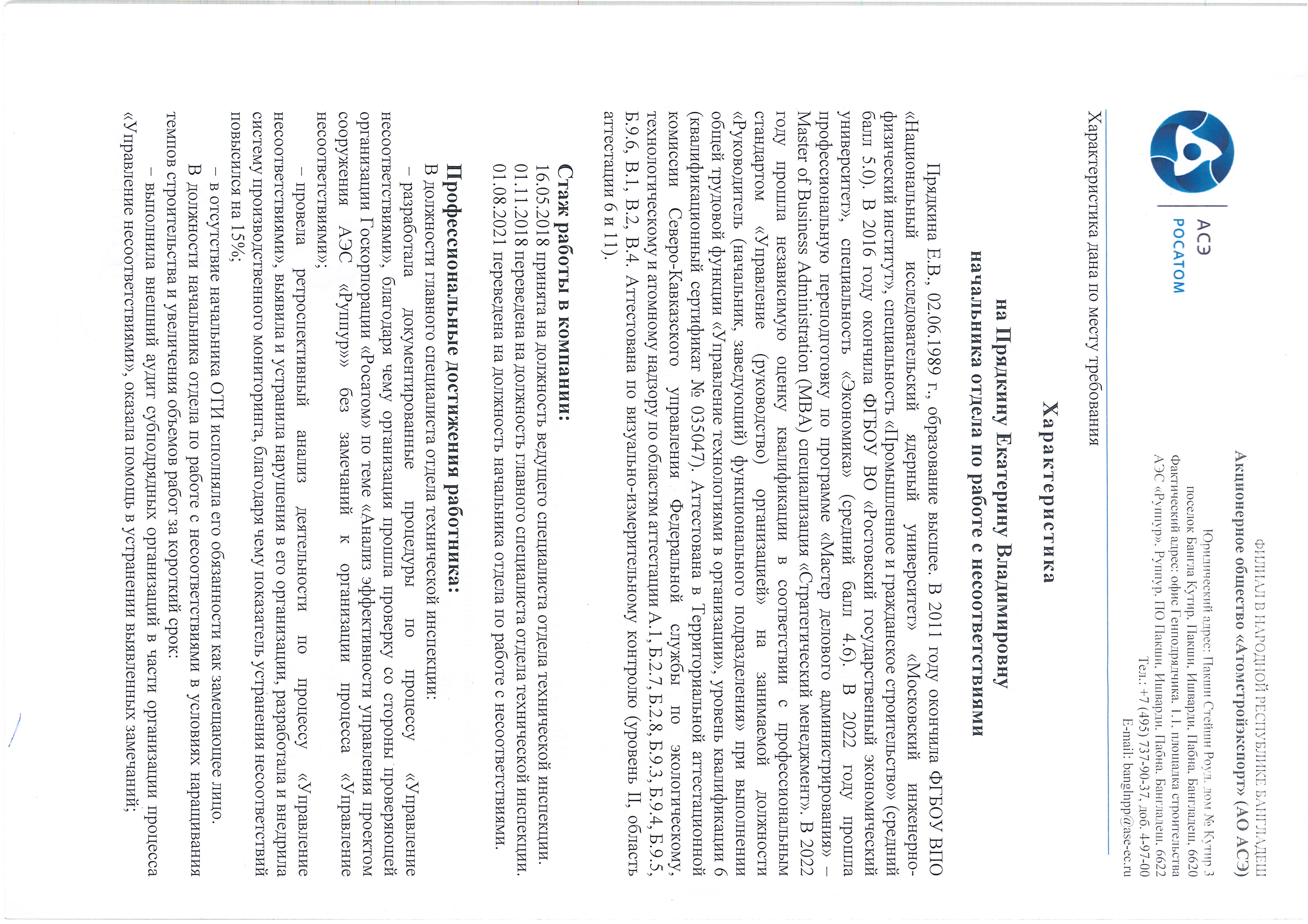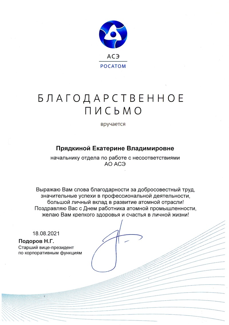 В должности начальника отдела разработала дорожную карту и выполнила организационные мероприятия по ней, что позволило в срок ввести в промышленную эксплуатацию ИС "ЕОС-Качество" на проекте АЭС "Руппур". Обеспечила эффективное функционирование системы и выполнение ФКПЭ компании (индекс снижения несоответствий). Пример моей управленческой отчетности по ссылке . Информация о ИС "ЕОС-Качество" на официальном сайте ГК РОСАТОМ по ссылке.