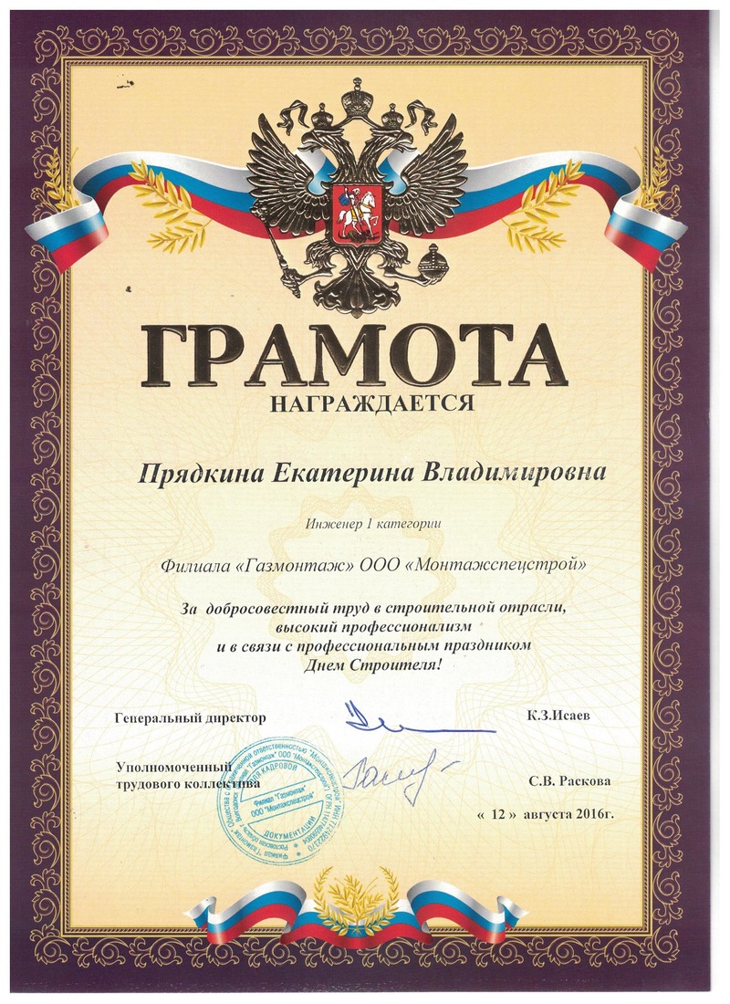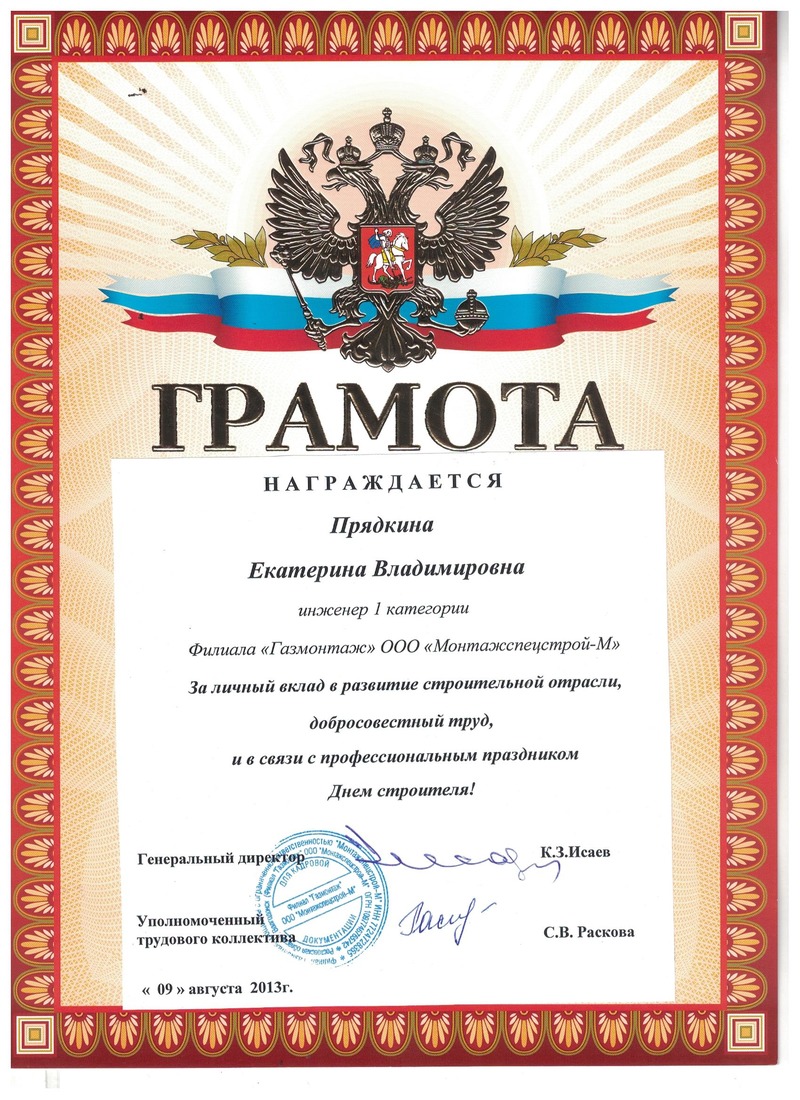 - Неоднократно была награждена грамотами руководства организации за высокие достижения и значительный вклад в развитие строительной отрасли.