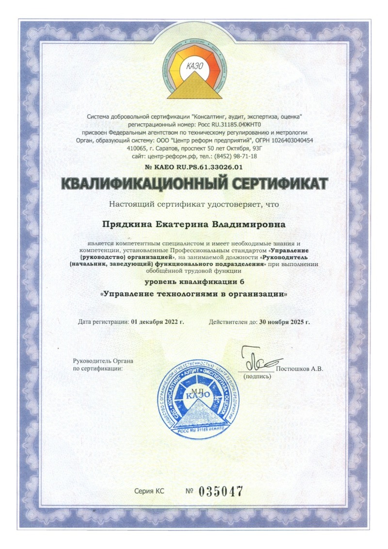 - Прошла обучение MBA и независимую оценку квалификации по профессиональному стандарту «Управление организацией на занимаемой должности руководителя функционального подразделения», что подтверждает мой профессиональный уровень и готовность к исполнению руководящих обязанностей.